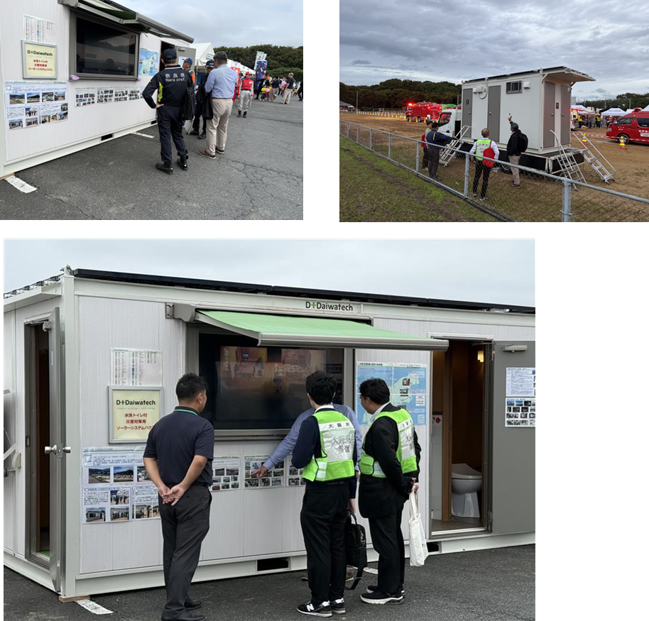 At Daiwatec, we exhibited the Kutsurogi unit, and our ultra‑water‑saving toilet Sazanami was used on-site as the actual toilet facility for the firefighting training area.