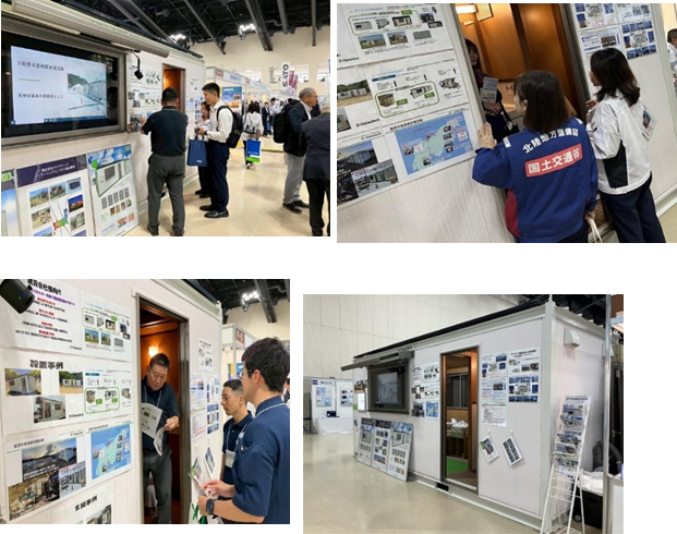 We exhibited our Solar House “Kutsurogi” equipped with a comfortable toilet and digital signage, as well as our ultra‑water‑saving solar‑powered toilet “Sazanami.”