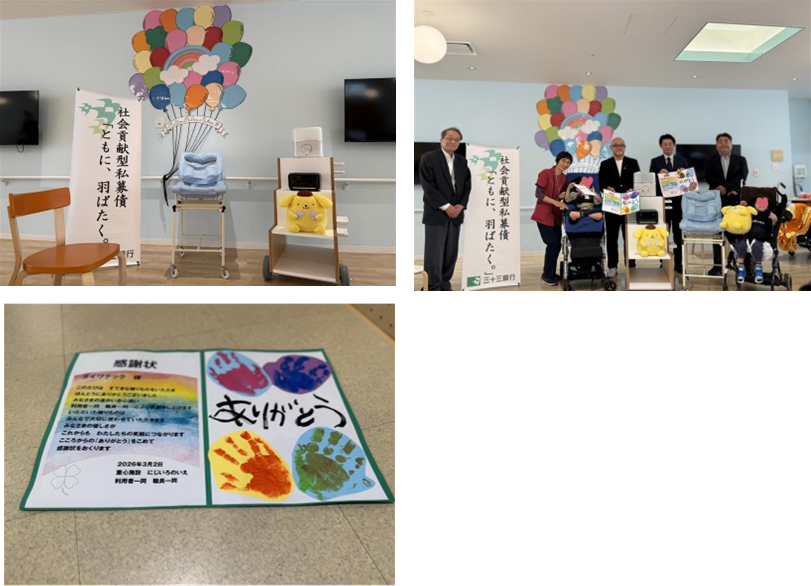 In connection with the issuance of the social-contribution private placement bond ‘Together, We Take Flight’, underwritten by The Sanjuusan Bank, Ltd., we presented donated items to the care facility Nijiiro no Ie.